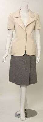 Cream wool short sleeve jacket with a rounded peaked collar, patch pockets and pearl buttons and a heather gray front-wrap A-line skirt with coordinating patch pockets and buttons. Labeled "Nina Ricci Paris / Made in France," approximately size 8.