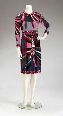 Abstract geometric print in pinks and grays, with a high round neck and long sleeves, fitted bodice straight skirt with center-gored pleat, falling to below the waist. Labeled "Emilio Pucci / Florence Italy" and "Exclusively for Saks Fifth Avenue," size 8.