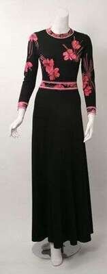 Black high-necked long sleeve bodice with bright pink tropical flowers, ankle length plain black jersey skirt.