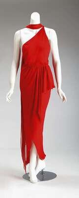 Halston red silk chiffon one-shoulder Grecian gown late 1970s