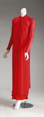 Long sleeve gown with attached scarf details, with an under-column of rayon jersey and overlay and sleeves of sheer chiffon. Labeled "Bill Blass," size 10.