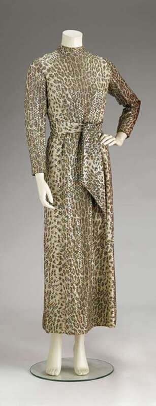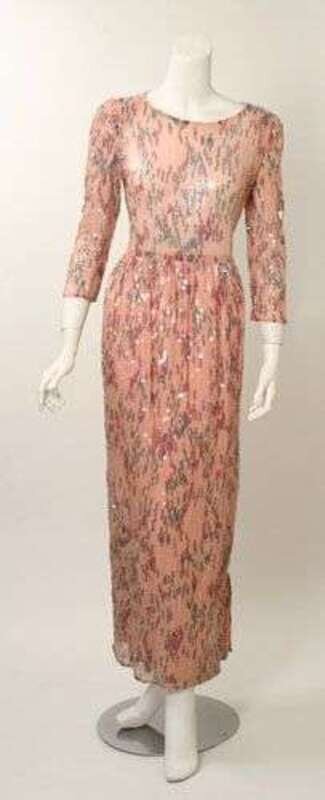 Both long sleeve and full length, one pink patterned chiffon with iridescent sequin overlay by Harold Levine, the other in metallic leopard-printed jersey with similar sequin overlay, unlabeled. Size 8-10.