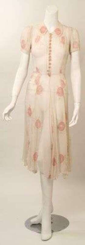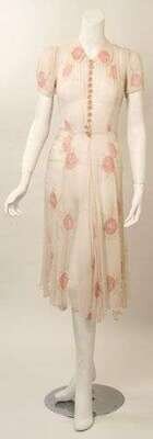 Sheer cream silk with hand painted pink embroidered flowers and leaves, fluted calf-length skirt and button-down bodice, with short sleeves and a peter-pan collar, shirred shoulder details. Size small.