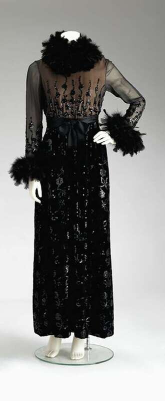 Silk chiffon long sleeve bodice with black sequin decoration and black cock feather ruff collar and cuffs, satin bow at waist and floor-length sequin-decorated velvet skirt. Labeled "Oscar de la Renta" and "Marsal," size 4-6.