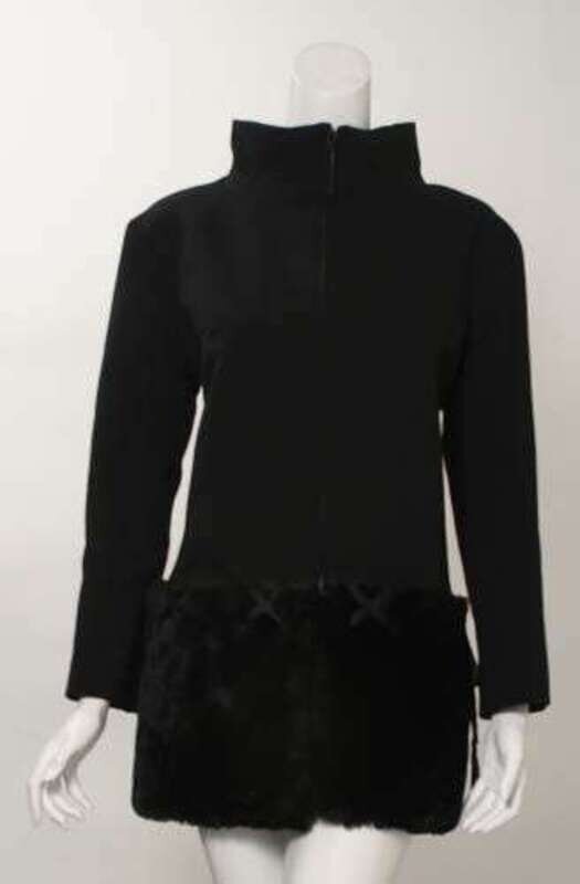 Black wool blend twill zip-front jacket with faux-fur and woven ribbon details. Size 8-10.