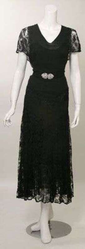 Long sheath dress with fluttery cap sleeves, rounded V-neck and trumpeted lace skirt, fully lined. Unlabeled.