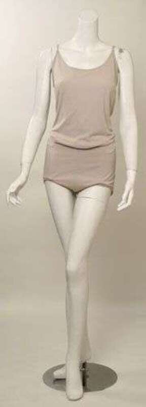 Pale gray one piece suit with fitted bottom and slightly loose tank-style top with thin straps. Labeled "Rudi Gernreich design for Harmon Knitwear California," size 10.