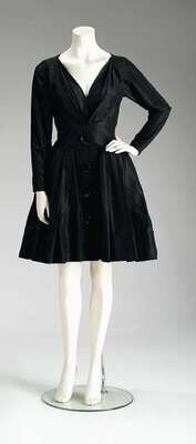 Long sleeve with a pleated pouffed-out skirt in black silk-blend taffeta, with large faceted black glass buttons from the waist down, V-neck neckline with gored pleat forming a faux interior layer (as a vest), hidden hooks to close at bust. Labeled "Yves Saint Laurent / Rive Gauche," size 38.