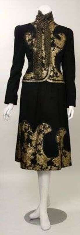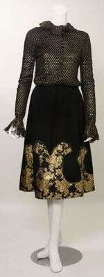 Black wool twill with gold floral and lace-pattern appliqué, below-the-knee elastic-waist skirt, and black and gold net blouse. Size 6-8.