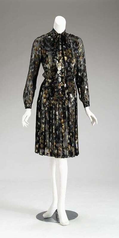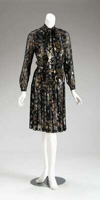 Chanel black silk chiffon metallic jacquard shirtwaist dinner dress 1970s