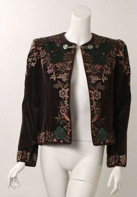In aubergine velvet with floral embroidery, pewter buttons at the collar with chain connector.