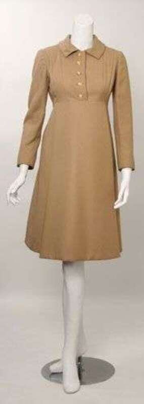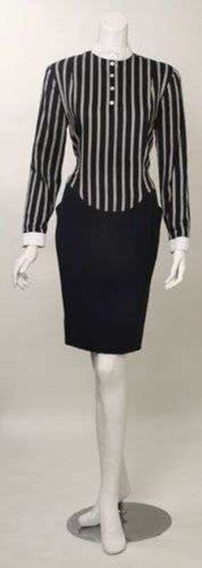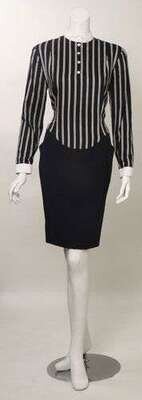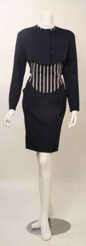 One in camel wool A-line long sleeve with gold buttons at the front bodice placket and cuffs; the other with a navy and while vertical-stripe shirtwaist, dropped-waist navy wool skirt and cropped matching navy wool jacket.