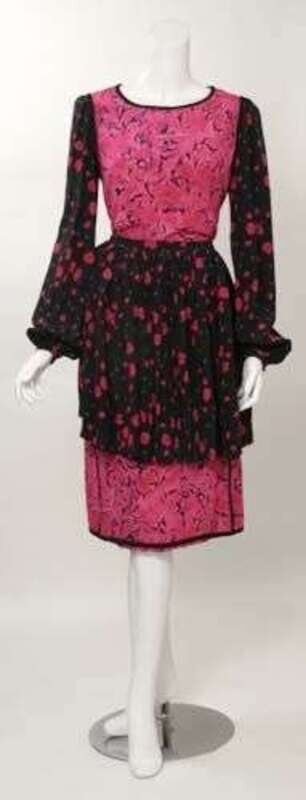 Fuchsia abstract-foliate day dress with black floral-printed long sleeves, hidden zip at the side, with a tie-neck knife-pleated capelet in the same fabric as the sleeves. Labeled "Givenchy / Made in France" and "53-527" written on tape label, verso.