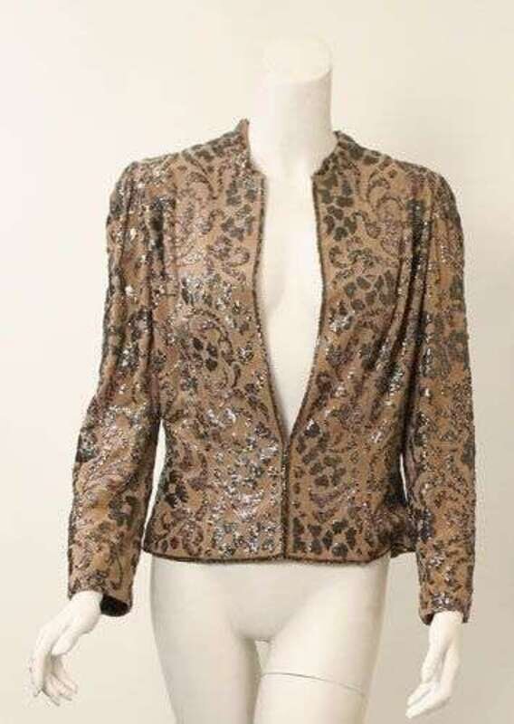 Tan velvet heavily beaded and decorated with roughly cut small metal beads in a foliate pattern, with small hook closures. Labeled "Bergdorf Goodman / Fifth Avenue at 58th Street."