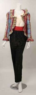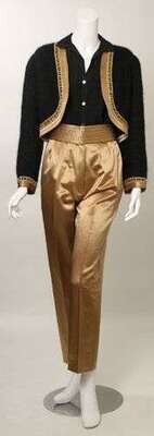 Black crepe short sleeved blouse and gold satin pants with a gold satin tie cummerbund, with a gold braid trimmed mohair bolero. Together with a Bill Blass plaid silk pants ensemble. Size 10.