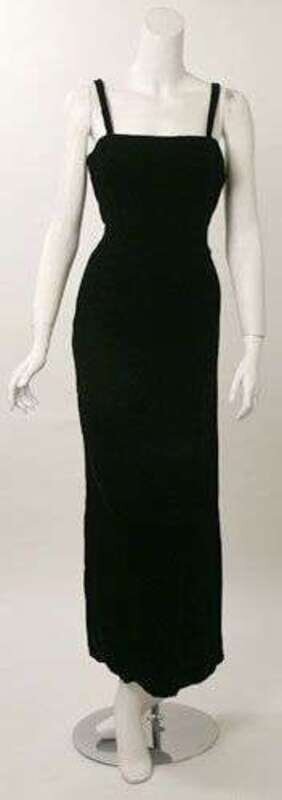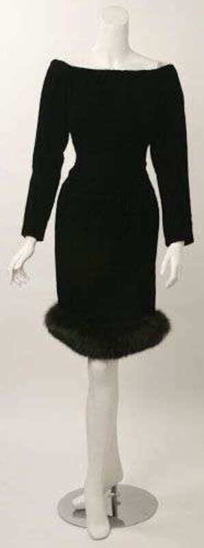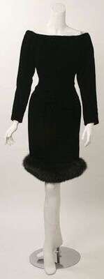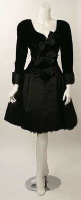One with long sleeves and sweetheart neckline, velvet bodice with satin fold-over cuffs and bubble skirt and with large satin bow details at front; the other in velvet with mink trim at the hem. Together with a long black velvet column gown from Richilene. All three labeled size 10.