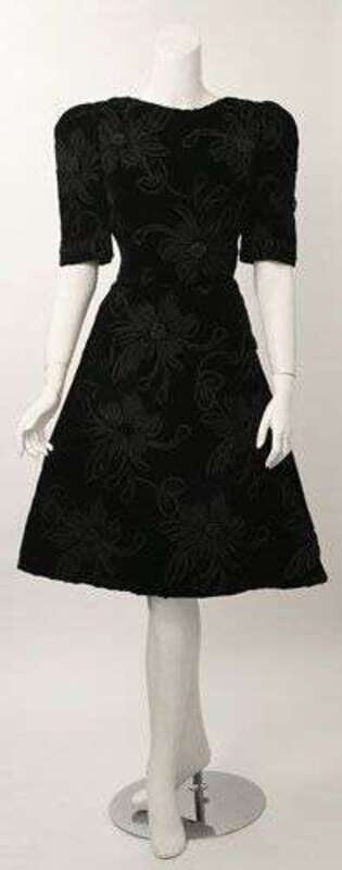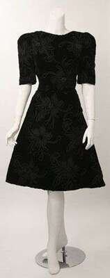 One calf-length in black velvet with short sleeves and wide A-line skirt, with an all-over applied black floral pattern; the other with a black velvet bodice and dramatic black and red silk draped skirt with large bow detail at front. Labeled "Scassi Boutique," size 10.