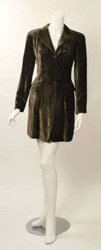 Dark olive green, longer silhouette. Labeled "Donna Karan New York," size 4.