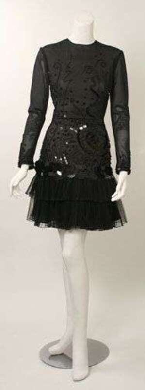 One raw silk strapless dress with a flared skirt and beaded sweetheart neckline; the other long sleeved with a high round neckline, abstract beaded and paiette pattern on the bodice with a tiered tulle skirt. Size 8.