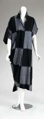 Black and gray blocked shirtwaist short sleeve caftan with short sleeves and slouching shoulders, with a gored pleat at the center and the right side buckling around to the back to form an asymmetrical drape. Labeled "Issey Miyake" etc., size small.