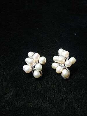 Large grape cluster pearl earring with nine 7mm white pearls and accented with eight diamonds set amongst the pearls and set into 14 karat white gold.