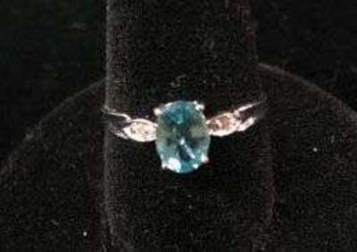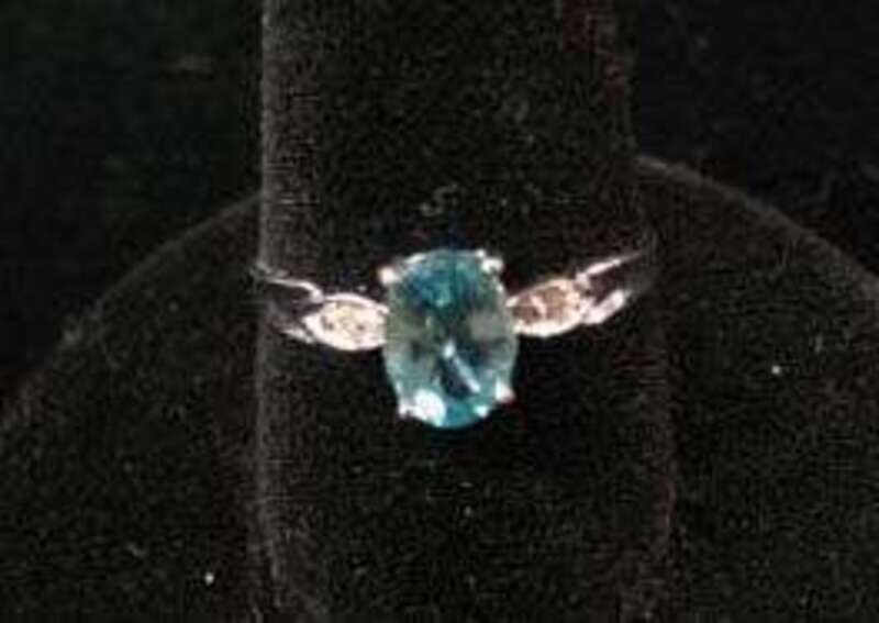 Oval cut Pariba apatite flanked by two small round cut diamonds and set into 10 karat yellow gold.