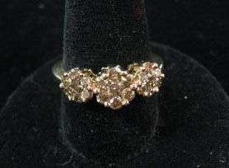 Lady's champagne colored daisy chain diamond ring, set with one carat total diamond weight into 10 karat yellow gold with white gold accent.