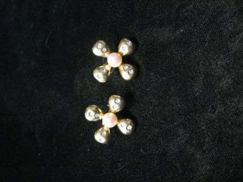 14 karat yellow gold flower form earrings featuring 8mm pink luster pearl and eight graduated diamonds set around, each earring.