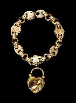 Lady's 14 karat yellow gold charm having a single "padlock" charm set with a small round cut diamond and pear shaped 'ruby'. Accompanied by original box and reciept of sale.