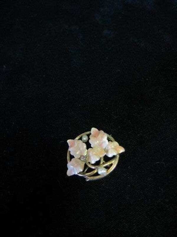 Gold circular-shaped pin with peach-colored leaves, two pearls and diamond