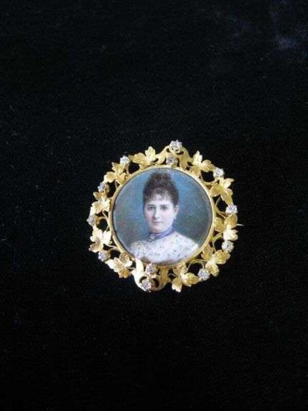 Portrait pin of woman with gold frame and diamond accent