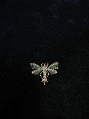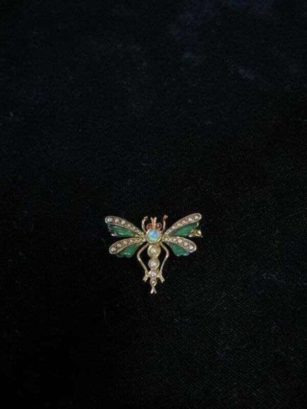 Enameled dragonfly pin, with pearls, opal, and rubies
