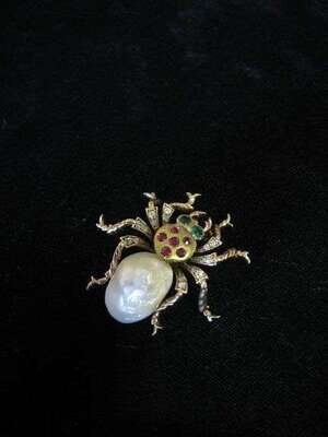 Gold spider with large baroque pearl, emerald eyes, diamonds and rubies