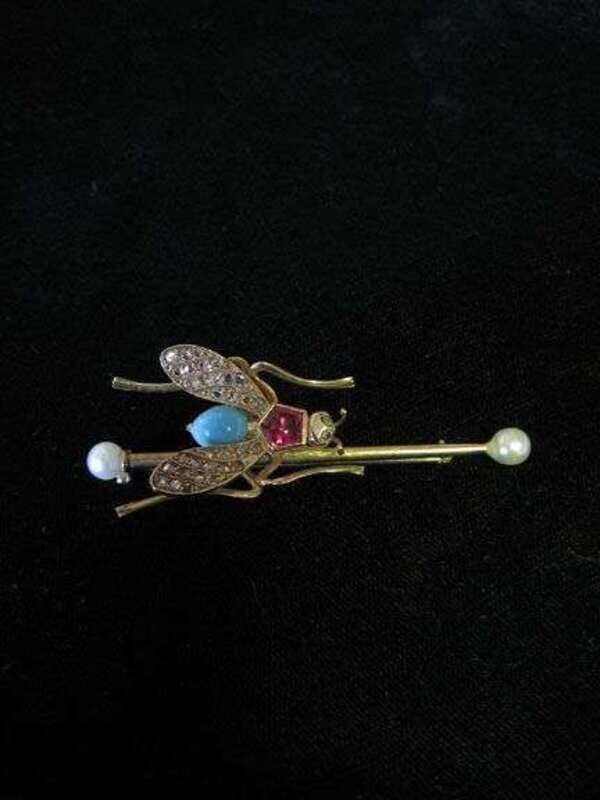 Gold insect brooch, with pearls, diamonds, turquoise stone, and pink stone