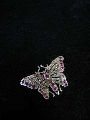 Silver butterfly pin, of diamonds and dark pink sapphires
