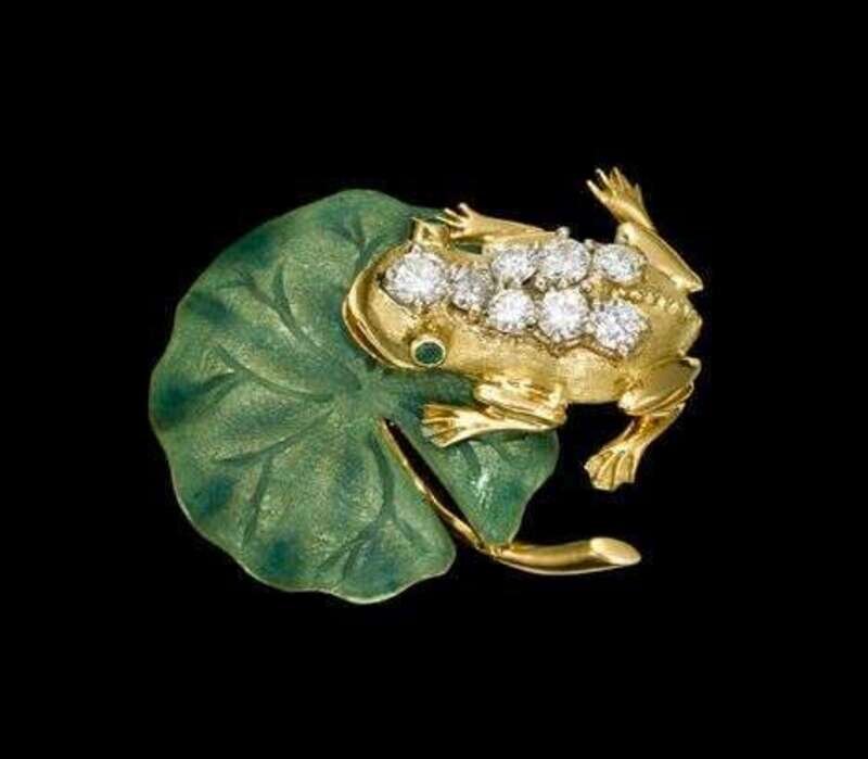 Eight brilliant cut diamonds weighing approximately .64 carats total weight sit atop an 18 karat yellow gold frog on enamel lily pad.