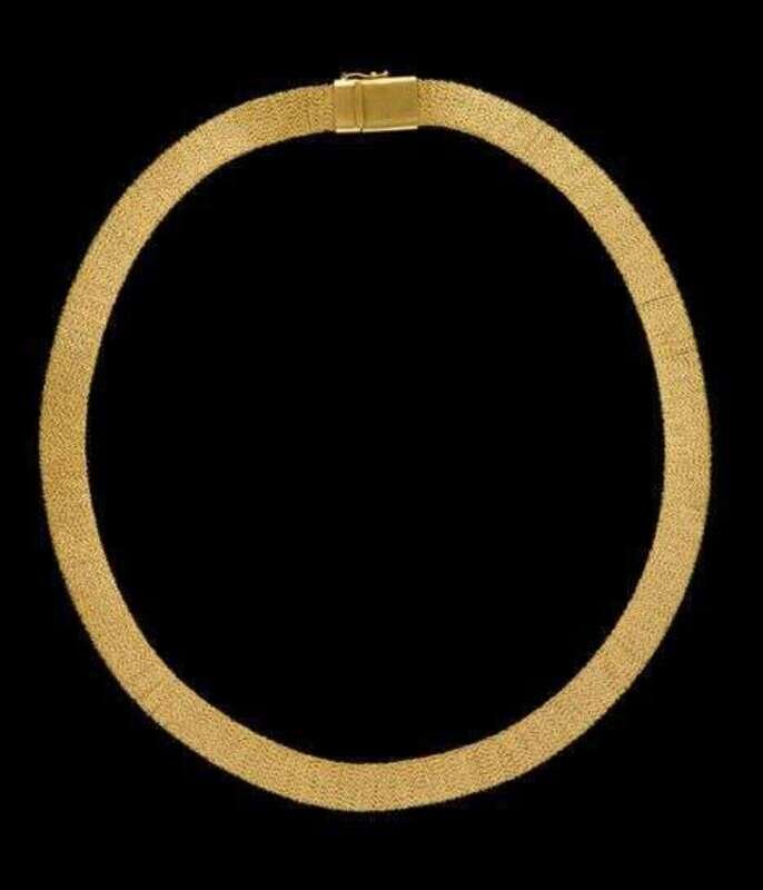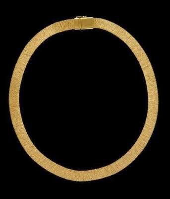 The unusual 22 karat yellow spun gold necklace has delicate box slide spring clasp and safety catch.
