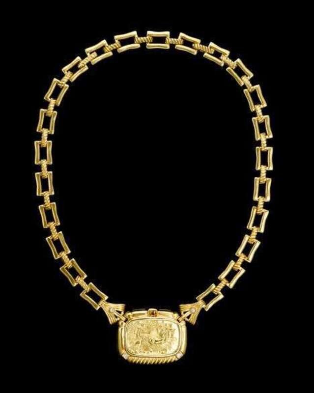 Stunning 18 karat yellow gold necklace featuring a Roman scene of a man riding a chariot. Stamped "Athena GB", 18 karat.