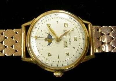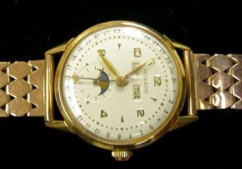 Gentleman's 18 karat yellow gold wristwatch with moon phase,day,date, Movado 1950s
