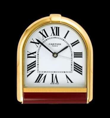 Gold plated traveling table clock with white face and red blocked bottom. Stamped "Cartier".