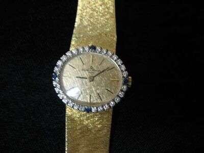 Set with approximately twenty-eight round cut diamonds and four sapphires and sapphire stem. Stamped on reverse with serial numbers, 474070, 38236T2.