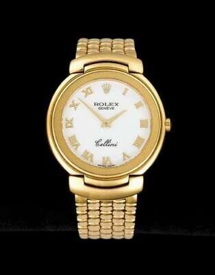 18 karat yellow gold, with Rolex markings and stamps on the band, white enamel face and flexible 18 karat yellow gold band. Roman numeral chapter ring.