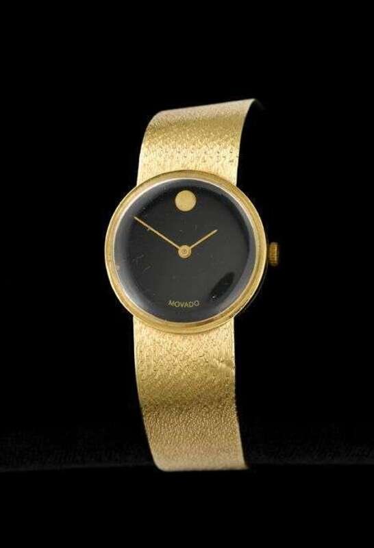 Traditional black face, set into 18 karat yellow gold case and bracelet. Stamped "Movado".