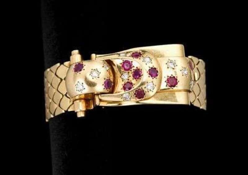 Unusual contemporary design set with ten round cut rubies and eleven round cut diamonds. Watch face is hidden under clasp.