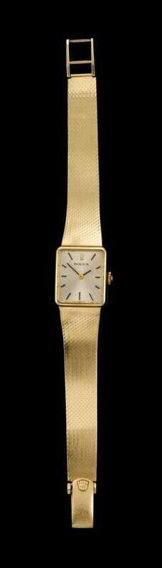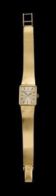 Delicate 14 karat yellow gold watch with mesh band, square off-white face with luster finish. In original box with original papers and polishing cloth.