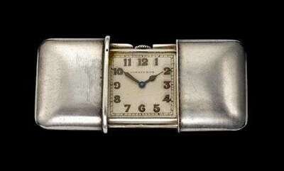 Opens to reveal a square faced clock signed Tiffany & Co., Movado works. Reverse is engraved with "Marie Zimmermann 15 Gamercy Park, New York" with the patent markings and other various illegible hallmarks, no. 1183248.