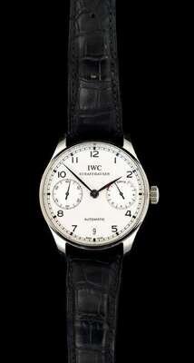Gentlemen's self-winding wristwatch with black dial and sapphire crystal. Seven day power reserve with power reserve display. Small seconds hand with stop function and date display. Black leather band.