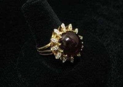 Cabochon garnet centered in round cut diamonds in a flower form ring, 14 karat yellow gold.