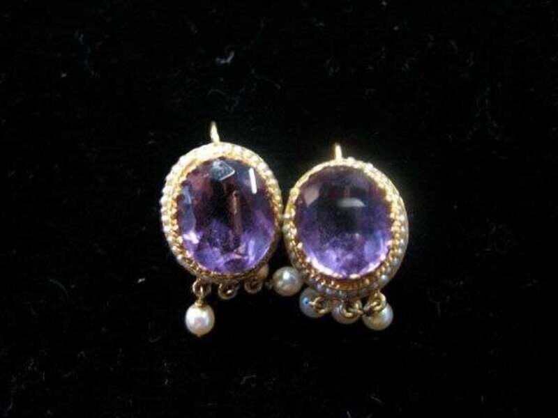 Oval amethyst earrings set with seed pearls and small cultured pearls in 14 karat yellow gold.