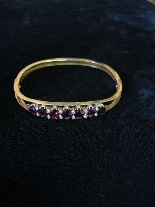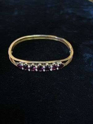 14 karat yellow gold hinged bracelet, with seven gemstones and seed pearls
